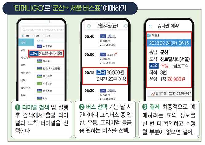 모바일 앱을 통해 고속버스를 예약하는 것도 매우 편리합니다. 아래 "티머니GO"와 같은 앱을 다운로드하여 실행하면, 쉽게 예매를 진행할 수 있습니다. 앱을 통해 원하는 시간, 버스 종류를 선택하고 결제까지 빠르게 진행할 수 있습니다. 예를 들어, 군산에서 서울로 가는 버스를 예매할 때, 출발 시간을 선택하고 요금을 확인하신 후 수정할 부분이 없으면 결제하실 수 있습니다.