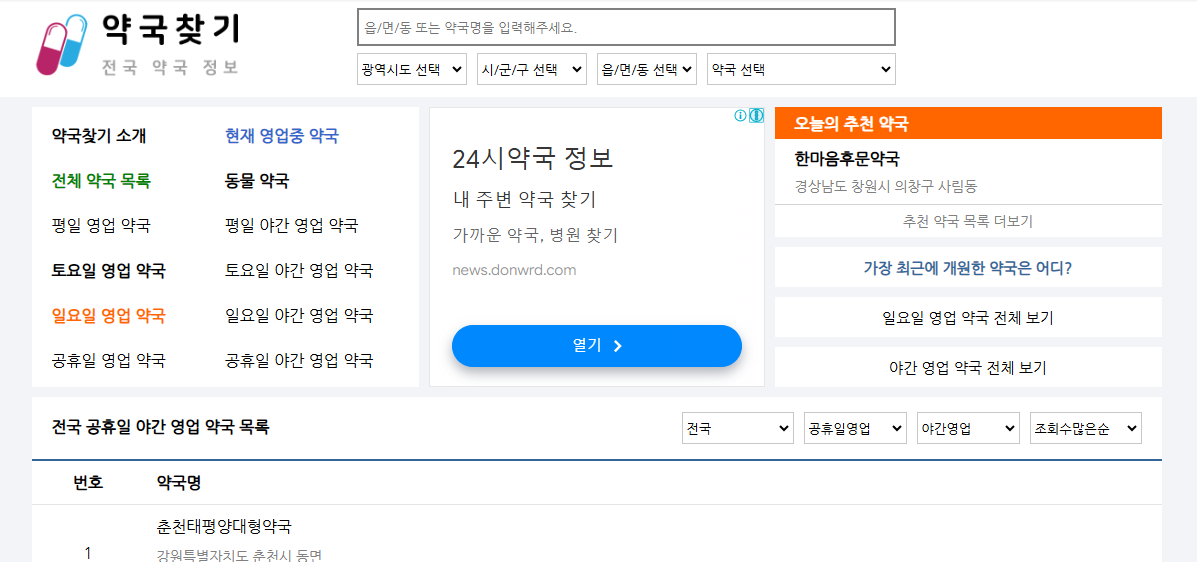 전국 일요일 야간 영업 약국 목록 - 전화번호 주소 지도 영업시간 휴무일 휴일지킴이 당번약국 정보
