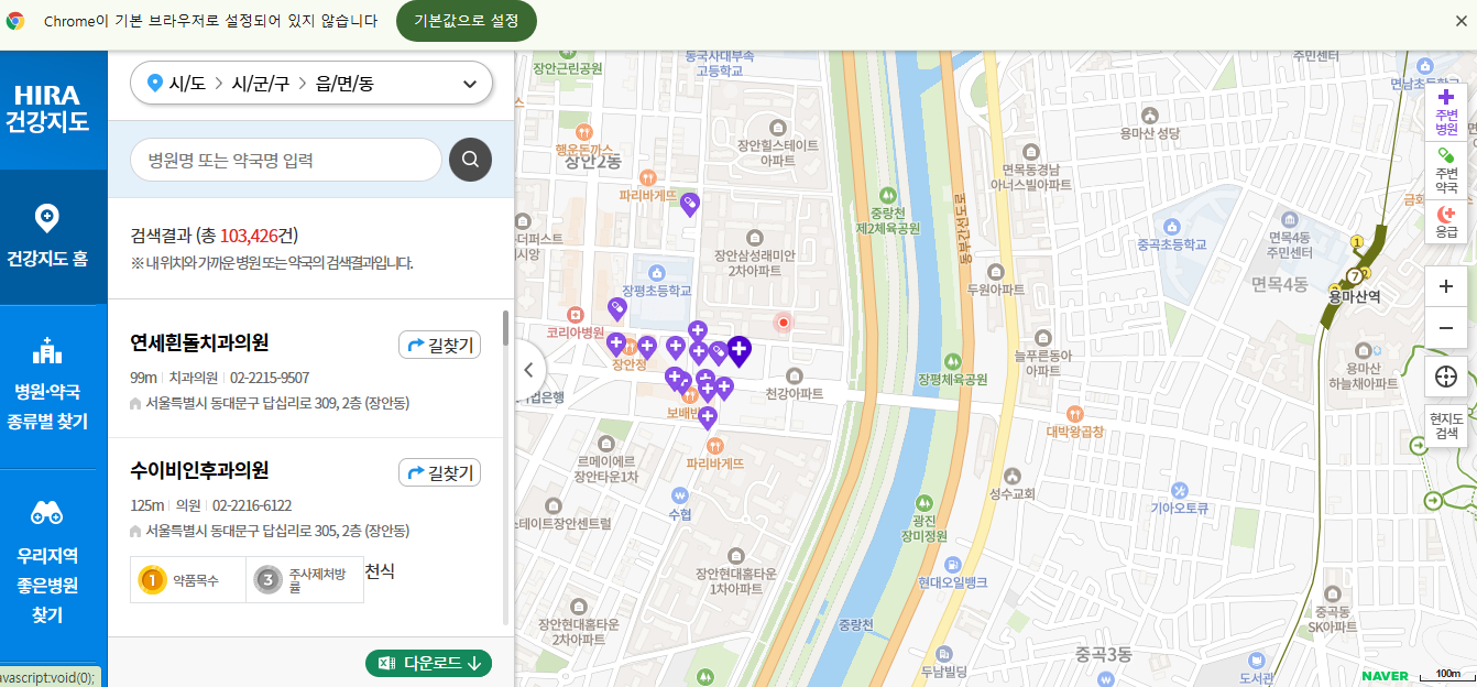 휴일 지킴이 링크 외에도 건강보험심사평가원의 건강지도 홈페이지를 통해 근처 약국 및 병원을 찾을 수 있으나,