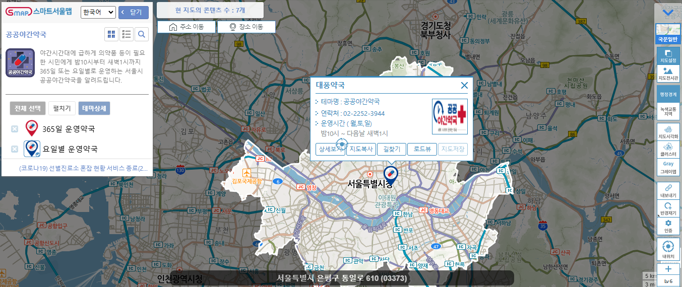 마지막으로는 스마트서울맵 링크를 통해 심야 및 공휴일 운영 약국을 찾는 방법입니다. 아래에 링크를 공유드리오니, 참고 부탁 드립니다.