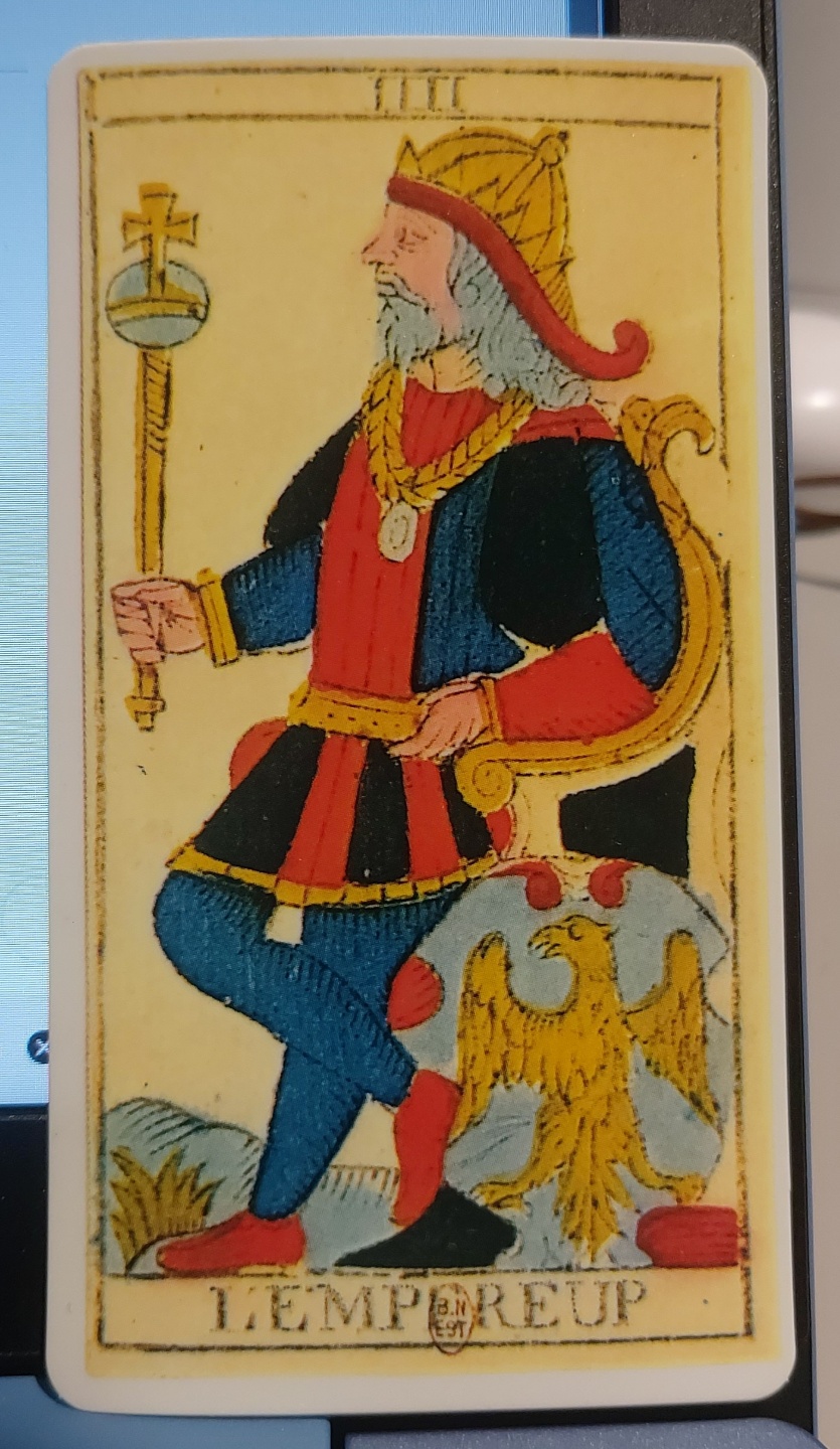 마르세유 타로의 네 번째 아카나는 황제(L'EMPEREUP)이다. 일반적으로는 세 번째 아카나인 여왕과 같이 권좌에 앉아서 정면을 응시하고 있을 수 있지만, 언뜻 보면 권좌 혹은 방패에 기대어 걸터앉은 듯이 보인다. 정면을 보여주지 않고 카드를 들여다보는 사람으로 하여금 측면으로 비스듬히 기댄 모습을 볼 수 있게 하며, 십자가가 달린 봉을 쥐고 있는 모습이 권력을 쥐고 있는 황제라는 의미답게 당당하고 거만해 보이기까지 한다. 그래서인지 전반적으로 마르세유 타로에서 이 아카나는 '황제'라는 단어가 주는 '힘', '권력' 등의 키워드가 지닌 긍정적인 느낌과 동시에 이에 따르는 부정적인 느낌을 줄 수 있다.
