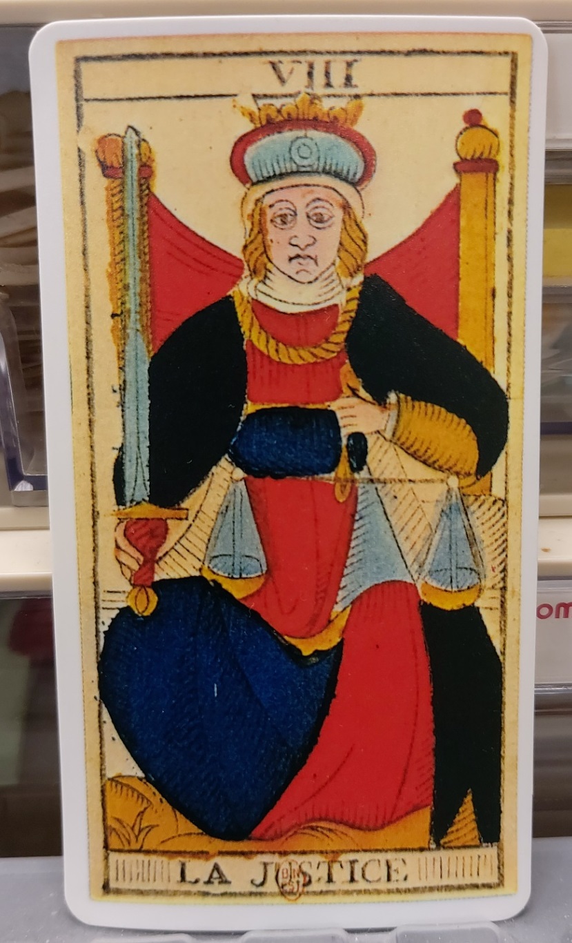 천칭 저울은 말 그대로 죄의 무게 혹은 어떤 사안의 경중을 있는 그대로 판단할 수 있게 해주는 도구이다. 칼이 오른손에 쥐어졌기에 법을 위반하였을 시, 가차없이 정확하게 처벌하겠다는 강력한 의지와 그 능력을 엿볼 수 있다. 정의의 여신이 눈을 뜨고 있기 때문에, 이 카드와 관련하여 어떤 판단과 관련한 상황을 해석할 시에 객관적인 부분 그대로 해석되는 것이 아니라, 약간의 직관적인 해석을 가미해야 할 것으로 보인다.
