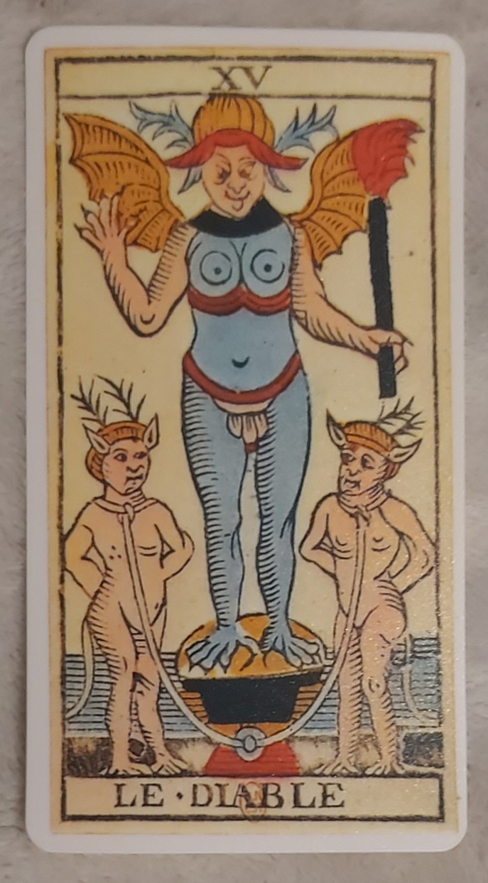 개인적으로 가장 충격적인 형상을 지닌 타로 아카나라고 생각한다. 누가 보더라도 악마가 아카나의 중앙에 자리 잡고 있다. 이 악마 아카나의 형상에서 가장 흥미로운 부분은 악마가 바로 여자와 남자의 특성을 모두 갖춘 양성구유, 자웅동체의 존재로 표현되었다는 점이다. 악마는 머리는 나뭇가지와 같은 사슴의 뿔이 어깨에는 박쥐의 날개를 달고 있으며 날카로운 손톱과 발톱은 물론이요, 매우 엽기적인 모습으로 왼손에는 빨갛게 타오르는 횃불을 쥐고 있다. 아카나의 구도 상 좌우 대칭적인 요소로서 이 악마의 양 옆에 그 역시 기괴한 뿔과 꼬리가 달린 작은 악마들이 서 있는데, 악마가 딛고 서있는 화로에서 연결된 줄을 목에 감고 있다. 이를 탯줄로 해석하는데, 이 아카나가 연금술의 상징을 차용했다고 보는 이유이다. 남자와 여자, 양성이 합쳐진 헤르마프로디토스(Hermaphroditus)의 형상은 연금술에서 흔히 말하는 결혼 혹은 결합을 의미한다고 한다. 앞서 언급한 헤르마프로디토스(Hermaphroditus) 그리스 신화에서 헤르메스와 아프로디테의 불륜의 결합으로 태어난 자식을 말한다. 헤르마프로디토스는 처음부터 자웅동체가 아닌 미소년이었으나, 추후 살마키스라는 님프의 구애로 인해 양성구유, 자웅동체로 변해버리게 된다. 악마가 양성을 지니고 있다는 점은 어딘지 성적 문란함과 타락, 음탕함을 떠올리게 하는 듯 보이기도 한다.