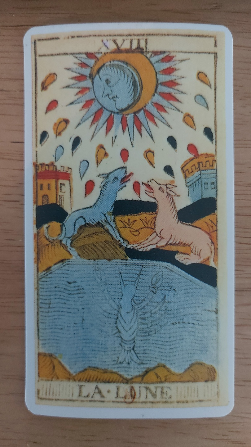 그렇기 때문에, 달의 상징인 이 카드는 메인 아카나 카드 스물 두 장 가운데 해석할 시에 가장 난해하게 다가온다.  먼저 카드 속 이미지들을 살펴보면 맨 아래 연못과 같이 보이는 형상 속에 가재로 보이는 듯한 한 마리 짐승이 달을 향해 집게를 뻗어있다. 연못 혹은 호수 주변에는 개 두 마리가 서로 마주 보며 혀를 내밀고 있다. 마치 형형 색색 떨어지는 이슬 혹은 빗물을 받아먹으려고 하는 것 같다. 둥근달이 아닌 초승달 형태의 달은 종교 속에서의 이미지와 신비스러움을 나타낸다. 달이 떠 있는 하늘에는 파랑, 빨강, 노랑, 검정 등 형형 색색의 물방울들이 떨어지고 있는데, 여성, 음, 그늘과 통할 수 있는 물의 성격을 지닌 이슬 혹은 비로 보는 것이 맞는 해석인 것 같다. 언뜻 보면, 가제, 개, 이슬방울 혹은 물방울 달이 서로 닿아있는 부분이 없다고 생각이 들겠지만. 개인적인 생각에 전체적으로 본다면, 물, 밤, 여성 등 우리가 생각하는 어둡고, 축축하고, 숨겨져 있는 것과 같은 음의 이미지들로 엮어 본다면, 그나마 쉽게 이 이미지들이 음을 상징하고 음의 상징 중 으뜸인 달로 본다면, 일맥상통할 수 있는 오브제들이라고 볼 수 있겠다.