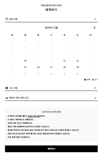 위와 같은 예약 화면이 나오면, "예약하기"를 클릭합니다. "예약하기" 클릭 후, 전화번호를 입력하고, 인증 코드를 문자로 전송받아 입력하면 아래와 같은 화면이 나오는데요. 희망하시는 일정을 클릭하여 예약하시면 됩니다.