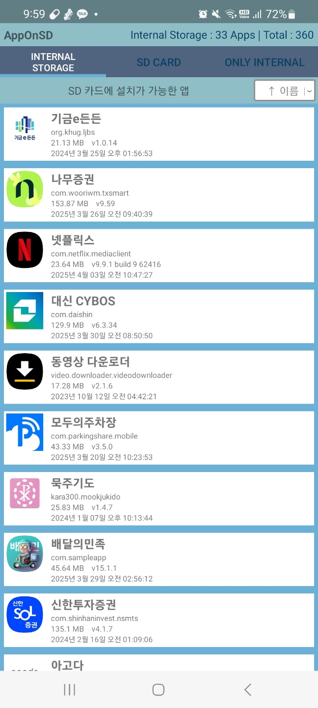 앱이 실행되면 자동으로 내 스마트폰의 모든 애플리케이션을 스캔하고, SD카드로 이동 가능한 앱들을 목록으로 보여줍니다. 아래와 같이 리스트를 확인해 주십시오.