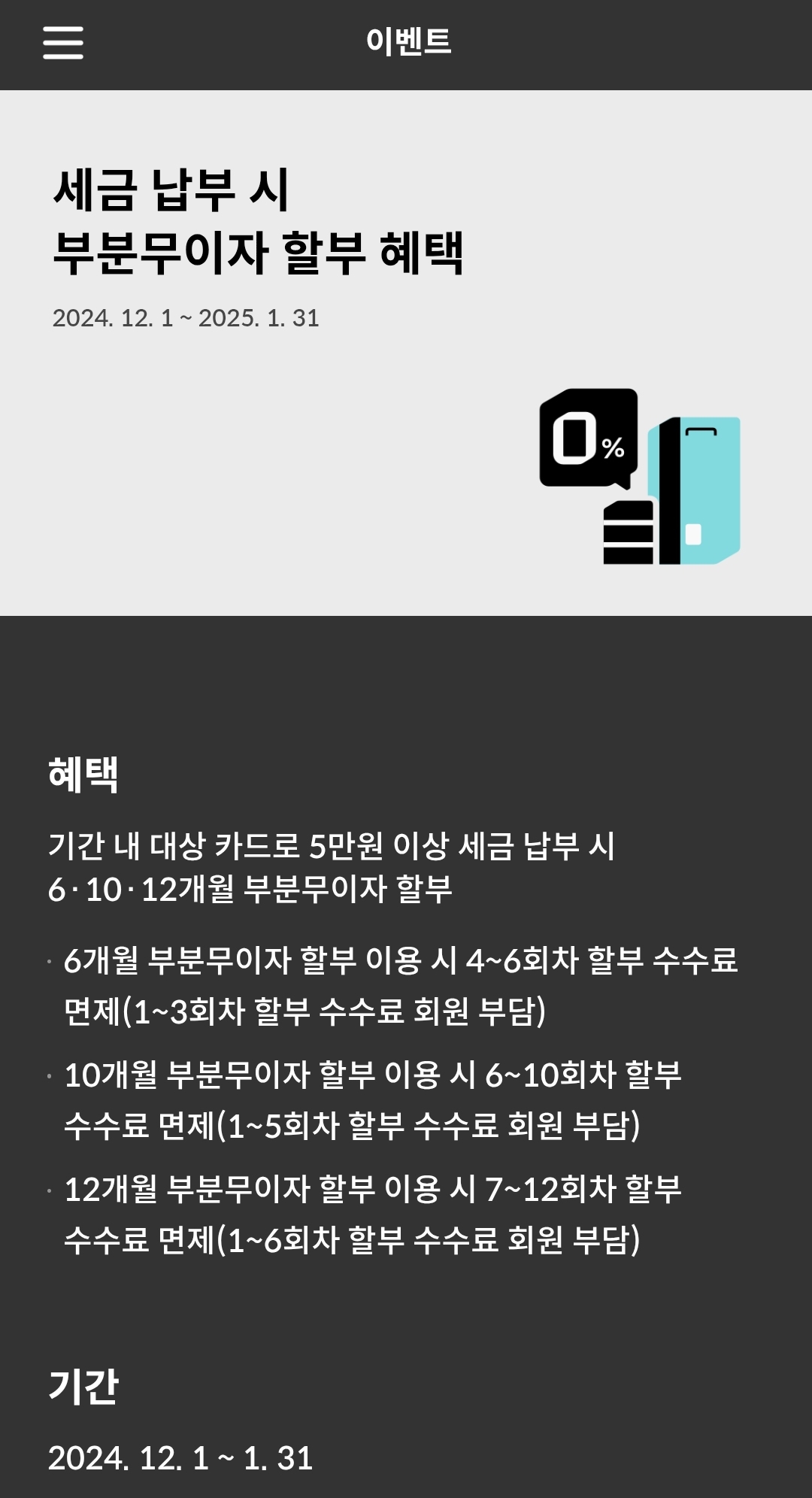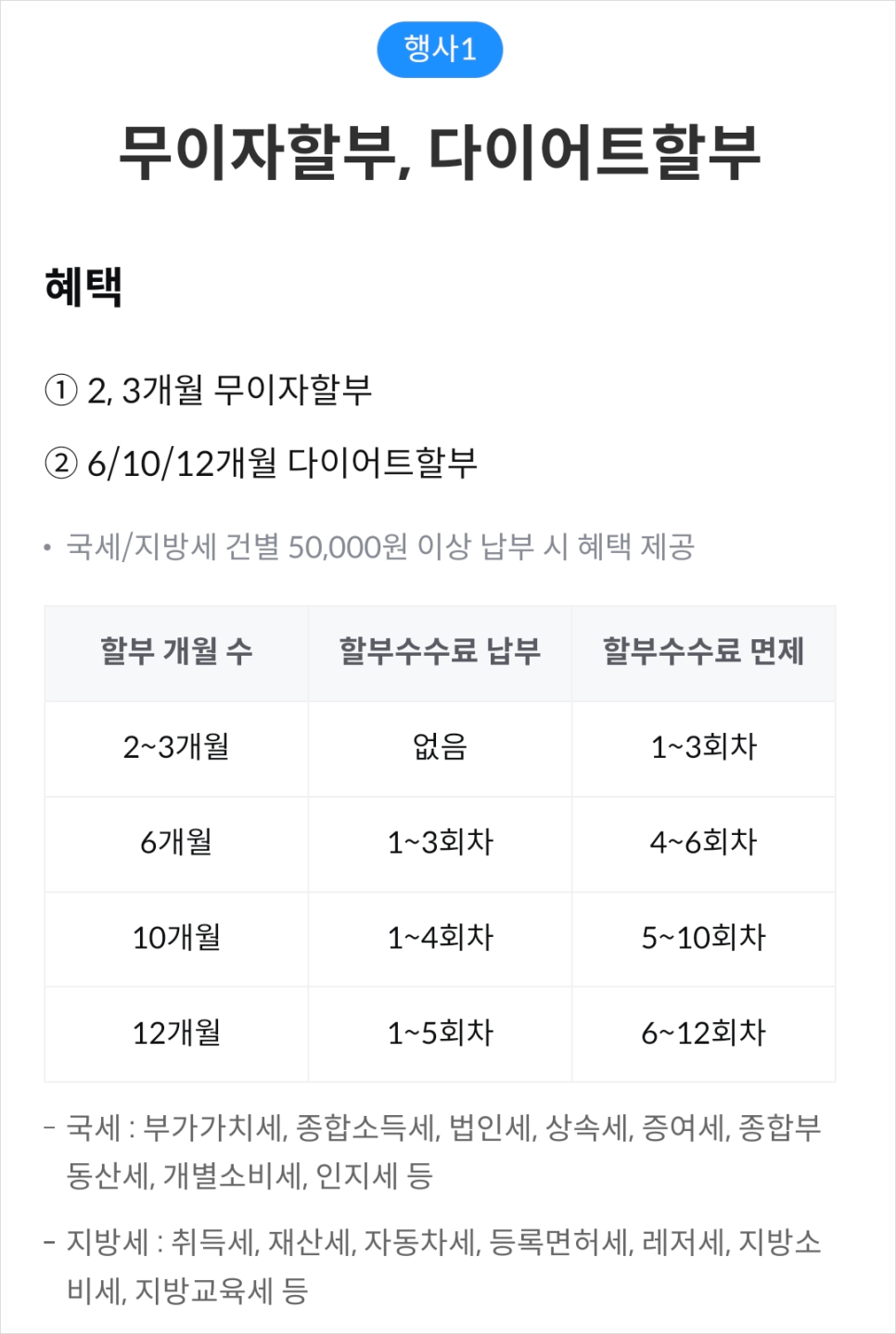 -. 12개월 부분 무이자 할부 : 1~5회 차 고객부담, 6회 차부터 무이자